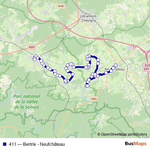 The first stop of the 411 bus route is Neufchateau Athénée and the last stop is Bertrix Grand Place. 411 (Bertrix - Neufchâteau) is operational during op werkdagen.