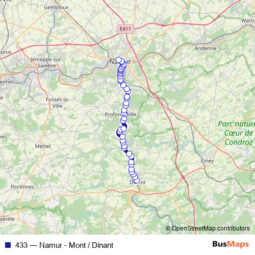 Click here to view the nearest 433 - Namur - Mont / Dinant bus stop.