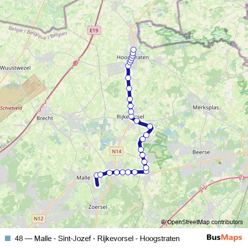 The first stop of the 48 bus route is Oostmalle Steenovenstraat and the last stop is Hoogstraten Van Aertselaerplein. 48 (Malle - Sint-Jozef - Rijkevorsel - Hoogstraten) is operational during dagelijks.