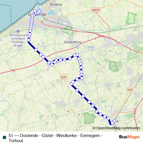 The first stop of the 51 bus route is Torhout Station perron 1 and the last stop is Oostende Station perron 9. 51 (Oostende - Gistel - Westkerke - Eernegem - Torhout) is operational during dagelijks.