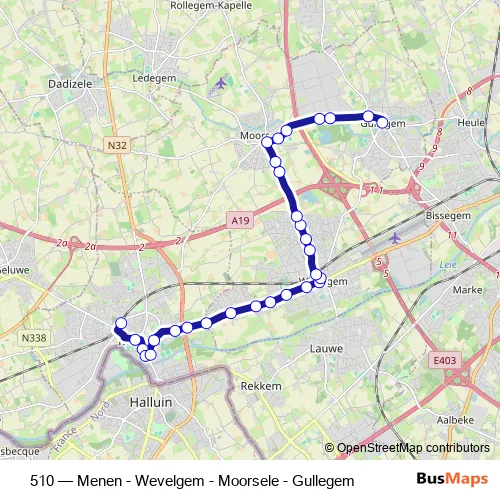 The first stop of the 510 bus route is Menen Station perron 5 and the last stop is Gullegem Plaats. 510 (Menen - Wevelgem - Moorsele - Gullegem) is operational during op werkdagen.