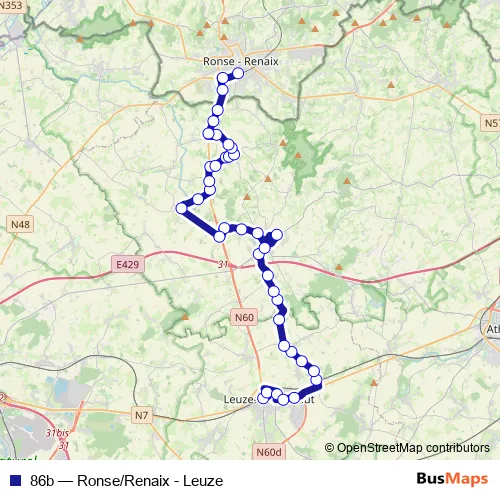 The first stop of the 86b bus route is Leuze-EN-Hainaut Sncb - Quai B and the last stop is Ronse/Renaix Station/Sncb. 86b (Ronse/Renaix - Leuze) is operational during op werkdagen.