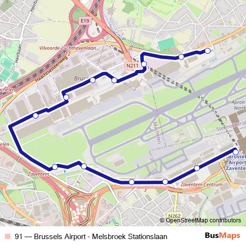 The first stop of the 91 bus route is Zaventem Brussels Airport perron B and the last stop is Melsbroek Stationslaan. 91 (Brussels Airport - Melsbroek Stationslaan) is operational during dagelijks.
