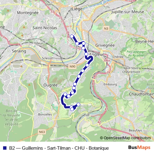 The first stop of the B2 bus route is Liege Gare des Guillemins - Quai B and the last stop is Sart-Tilman Botanique. B2 (Guillemins - Sart-Tilman - CHU - Botanique) is operational during dagelijks.