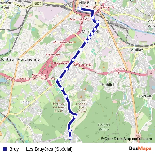 The first stop of the Bruy bus route is Marcinelle Sanatorium and the last stop is Charleroi Gare Centrale - Quai 19. Bruy (Les Bruyères (Spécial)) is operational during op werkdagen.