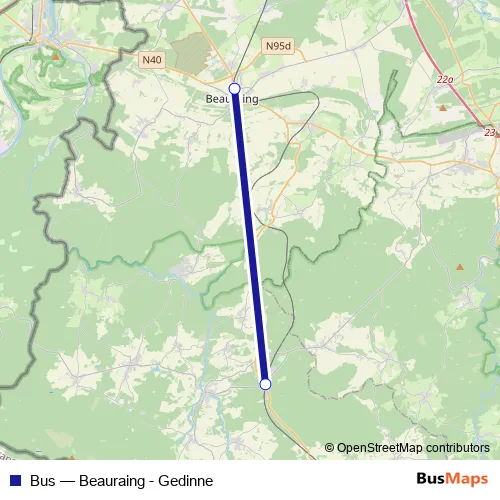 The first stop of the Bus bus route is Beauraing and the last stop is Gedinne. Bus (Beauraing - Gedinne) is operational during in het weekend.