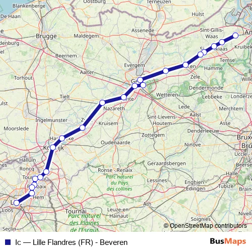 Stationsplein - Nieuwkerkenstraat - Stationstunnel - Gavermolenstraat - Schrijberg - Beerveldse Baan - Oktrooiplein - Robert Rinskopflaan - Florastraat - Statieplein - Noorderlaan - Zuidstraat - Stationsplein - Place de la Gare - Stationplein - Rue de Liège - Luikstraat - Rue d'Hondschoote - Place de la Gare - Rue des Ogiers - Avenue de Flandre - Rue Édouard Delesalle