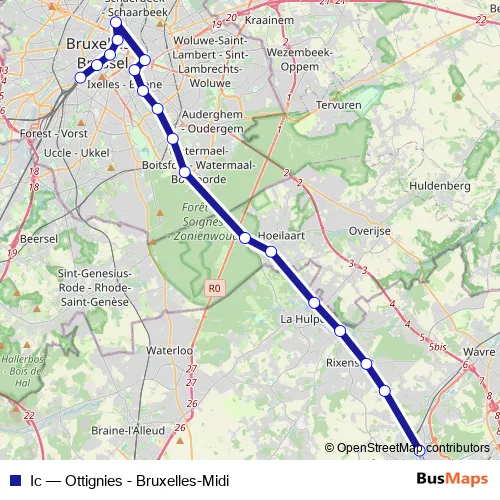 The first stop of the Ic rail route is Ottignies and the last stop is Brussel-Zuid. Ic (Ottignies - Bruxelles-Midi) is operational during in het weekend.