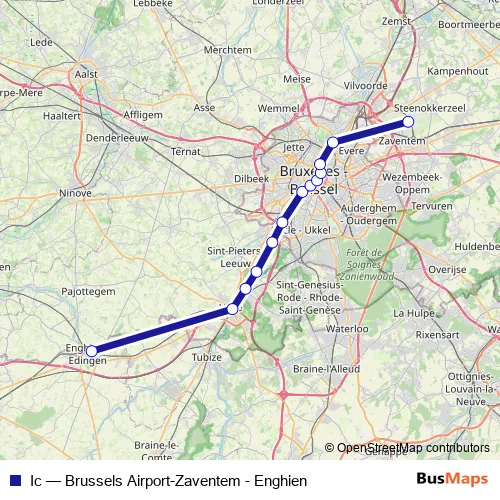 The first stop of the Ic rail route is Edingen and the last stop is Brussels Airport-Zaventem. Ic (Brussels Airport-Zaventem - Enghien) is operational during in het weekend.