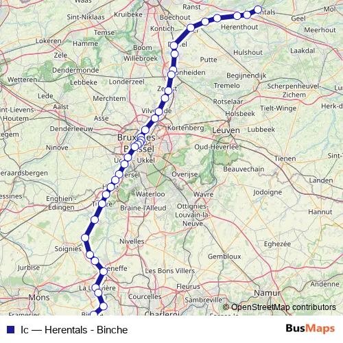 The first stop of the Ic rail route is Herentals and the last stop is Binche. Ic (Herentals - Binche) is operational during dagelijks.