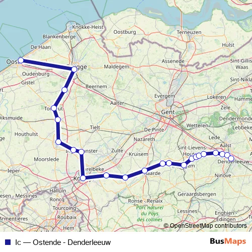 The first stop of the Ic rail route is Oostende and the last stop is Denderleeuw. Ic (Ostende - Denderleeuw) is operational during dagelijks.