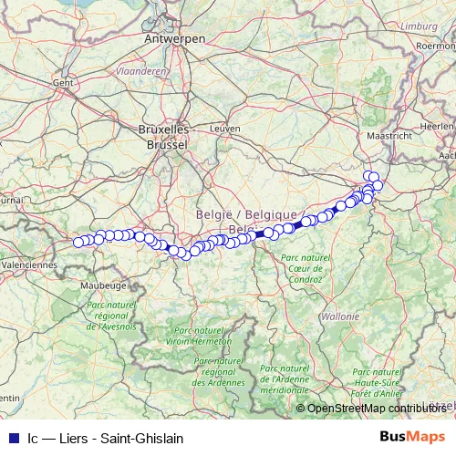 The first stop of the Ic rail route is Liers and the last stop is Saint-Ghislain. Ic (Liers - Saint-Ghislain) is operational during in het weekend.