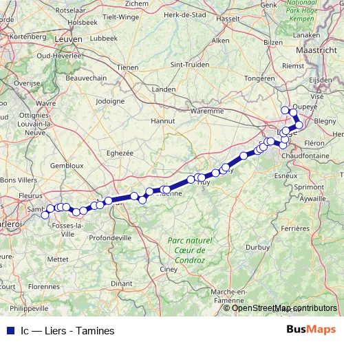 The first stop of the Ic rail route is Tamines and the last stop is Liers. Ic (Liers - Tamines) is operational during in het weekend.