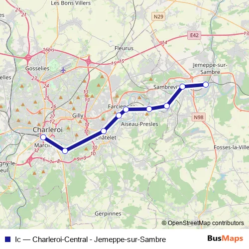 The first stop of the Ic rail route is Jemeppe-sur-Sambre and the last stop is Charleroi-Centraal. Ic (Charleroi-Central - Jemeppe-sur-Sambre) is operational during dagelijks.