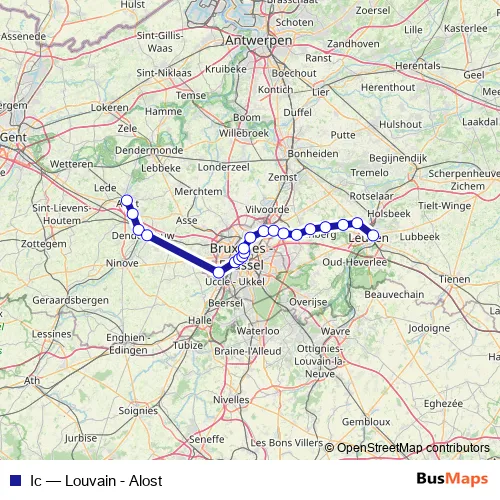 The first stop of the Ic rail route is Aalst and the last stop is Leuven. Ic (Louvain - Alost) is operational during dagelijks.