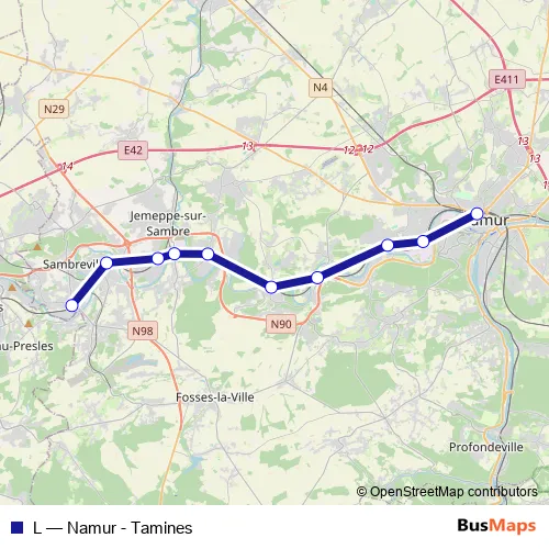 The first stop of the L rail route is Namen and the last stop is Tamines. L (Namur - Tamines) is operational during in het weekend.
