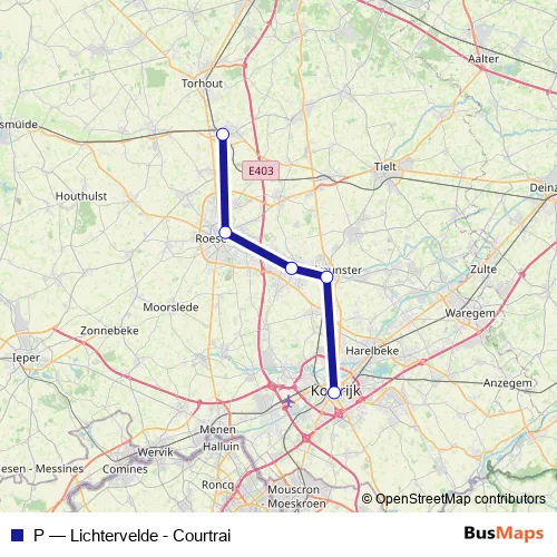 The first stop of the P rail route is Lichtervelde and the last stop is Kortrijk. P (Lichtervelde - Courtrai) is operational during dagelijks.
