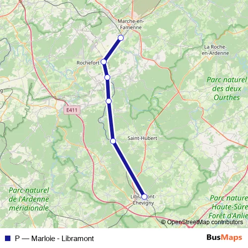 The first stop of the P rail route is Marloie and the last stop is Libramont. P (Marloie - Libramont) is operational during dagelijks.