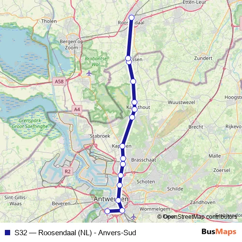 The first stop of the S32 rail route is Antwerpen-Zuid and the last stop is Roosendaal (Nl). S32 (Roosendaal (NL) - Anvers-Sud) is operational during in het weekend.