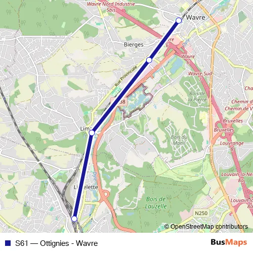 The first stop of the S61 rail route is Ottignies and the last stop is Waver. S61 (Ottignies - Wavre) is operational during in het weekend.