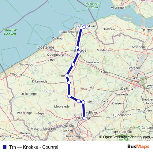The first stop of the Trn rail route is Knokke and the last stop is Kortrijk. Trn (Knokke - Courtrai) is operational during dagelijks.