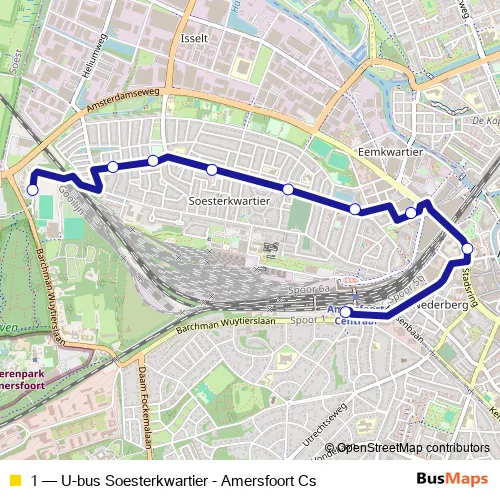 The first stop of the 1 bus route is Amersfoort, Centraal Station and the last stop is Amersfoort, Birkhoven Park. 1 (U-bus Soesterkwartier - Amersfoort Cs) is operational during dagelijks.