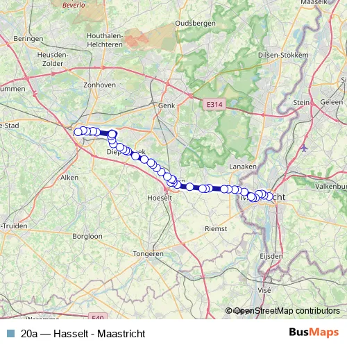 The first stop of the 20a bus route is Hasselt Station perron 16 and the last stop is Maastricht Station perron D. 20a (Hasselt - Maastricht) is operational during dagelijks.
