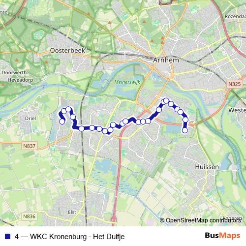 The first stop of the 4 bus route is Arnhem, WKC Kronenburg [ D ] and the last stop is