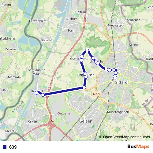 The first stop of the 639 bus route is Stein, Urmond Heirstraat/Mauritslaan and the last stop is Sittard-Geleen, Sittard Station. 639 is operational during op werkdagen.