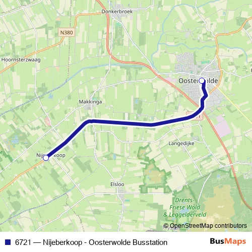 The first stop of the 6721 bus route is Nijeberkoop, Nijeberkoop Provincialeweg and the last stop is Oosterwolde, Busstation (Perron A). 6721 (Nijeberkoop - Oosterwolde Busstation) is operational during dagelijks.