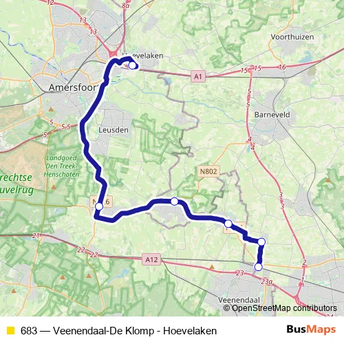 The first stop of the 683 bus route is De Klomp, Stat. V'daal-de Klomp and the last stop is Hoevelaken, Van Lodenstein College. 683 (Veenendaal-De Klomp - Hoevelaken) is operational during op werkdagen.