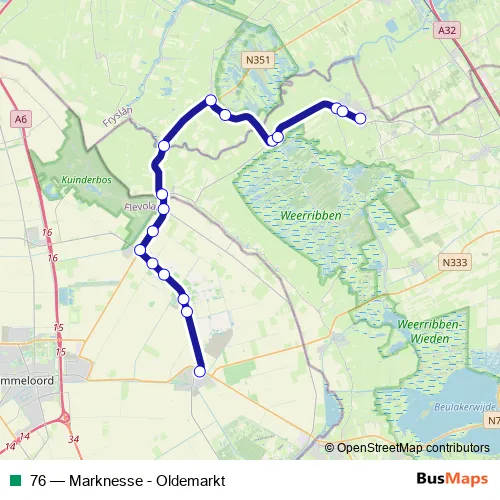 The first stop of the 76 bus route is Marknesse, Busstation and the last stop is Oldemarkt, Koningin Julianaweg. 76 (Marknesse - Oldemarkt) is operational during op werkdagen.