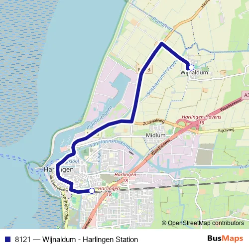 The first stop of the 8121 bus route is Wijnaldum, Van der Ploegstrjitte and the last stop is Harlingen, Station. 8121 (Wijnaldum - Harlingen Station) is operational during dagelijks.