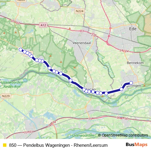 The first stop of the 850 bus route is Wageningen, Busstation and the last stop is Leersum, Donderberg. 850 (Pendelbus Wageningen - Rhenen/Leersum) is operational during dagelijks.