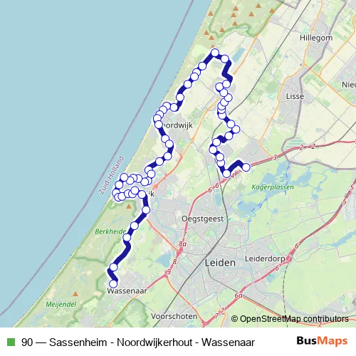 The first stop of the 90 bus route is Sassenheim, Station (Perron D) and the last stop is Noordwijkerhout, Brink. 90 (Sassenheim - Noordwijkerhout - Wassenaar) is operational during dagelijks.