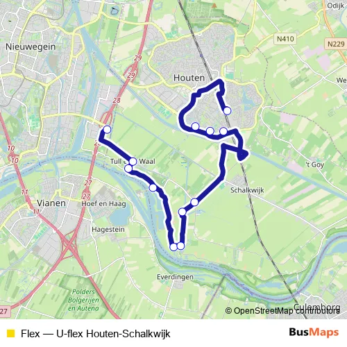 The first stop of the Flex bus route is Nieuwegein, Transferium Linielanding and the last stop is Houten, Station Castellum. Flex (U-flex Houten-Schalkwijk) is operational during dagelijks.