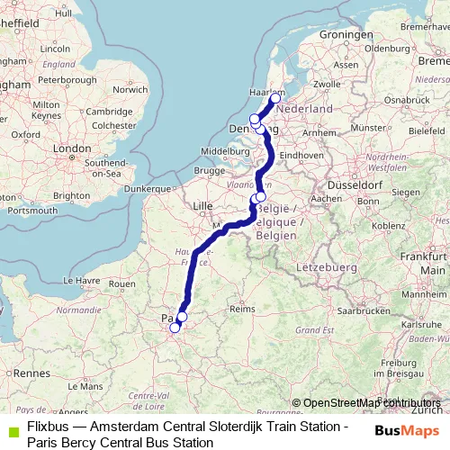 The first stop of the Flixbus bus route is Paris Gare de Bercy Seine and the last stop is Amsterdam Piarcoplein P+R Sloterdijk. Flixbus (Amsterdam Central Sloterdijk Train Station - Paris Bercy Central Bus Station) is operational during dagelijks.