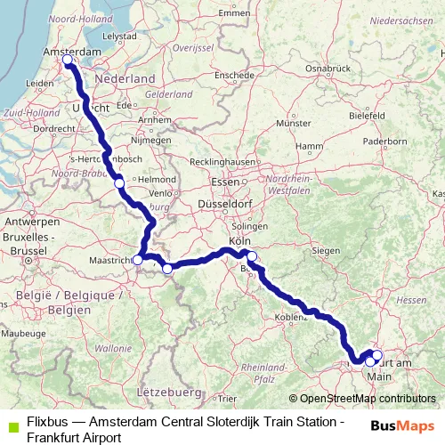 The first stop of the Flixbus bus route is Frankfurt Airport P36 and the last stop is Amsterdam Piarcoplein P+R Sloterdijk. Flixbus (Amsterdam Central Sloterdijk Train Station - Frankfurt Airport) is operational during dagelijks.