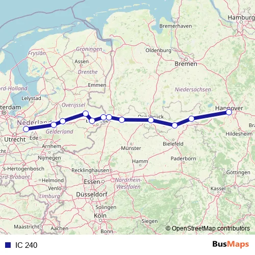 The first stop of the IC 240 rail route is Bad Bentheim and the last stop is Amersfoort. IC 240 is operational during in het weekend.