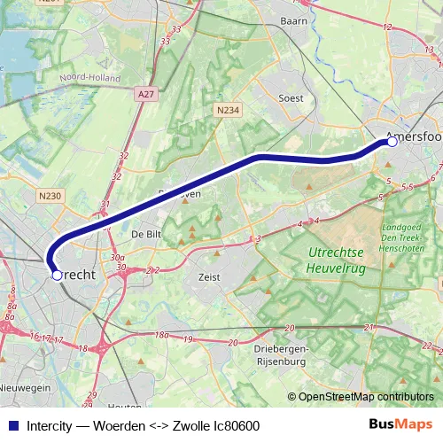 The first stop of the Intercity rail route is Amersfoort Centraal and the last stop is