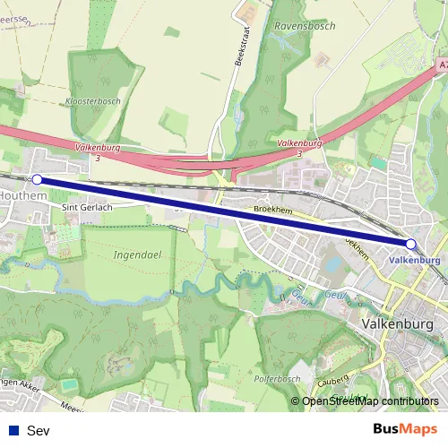 The first stop of the Sev metro route is Valkenburg, Bf and the last stop is Valkenburg, Bf. Sev is operational during dagelijks.