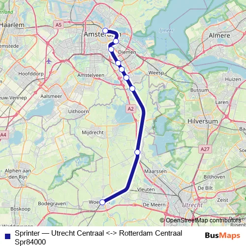 The first stop of the Sprinter rail route is Woerden and the last stop is Amsterdam Centraal. Sprinter (Utrecht Centraal <-> Rotterdam Centraal Spr84000) is operational during in het weekend.