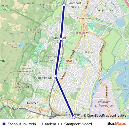 The first stop of the Stopbus ipv trein bus route is [Santpoort Noord] OV halte Santpoortse Dreef richting Haarlem and the last stop is [Haarlem] Voorplein station OV (uitstaphalte). Stopbus ipv trein (Haarlem <-> Santpoort Noord) is operational during dagelijks.