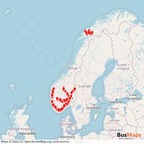 NOR-WAY Bussekspress operates in the following cities: Bergen, Evenskjer, Forde, Harstad, Heggenes, Innbygda, Narvik, Oslo, Sauland, Stavanger, Sveio.