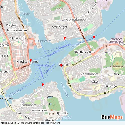 Sundbåten, based in Kristiansund, More og Romsdal, Norway, offers a reliable and comprehensive network of public transport services, including Ferry. Our platform provides detailed and up-to-date information on routes, schedules, stops, and arrivals for all services operated by Sundbåten. Whether you're planning your daily commute or exploring the city, our tools help you find the nearest stop and the best route to your destination.