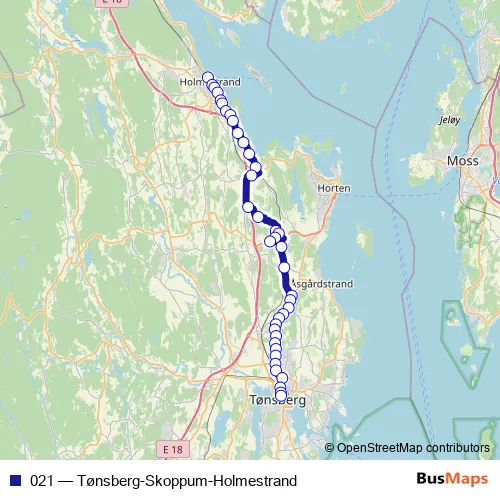 The first stop of the 021 bus route is Holmestrand stasjon and the last stop is Tønsberg rutebilstasjon. 021 (Tønsberg-Skoppum-Holmestrand) is operational during på hverdager.