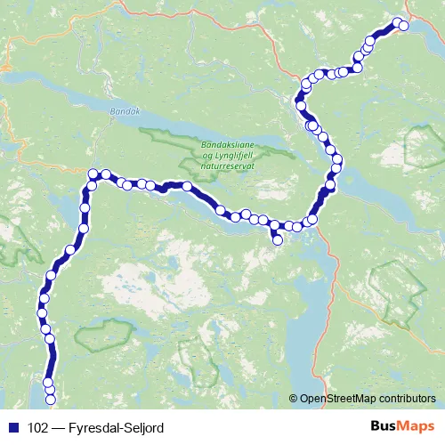 The first stop of the 102 bus route is Fyresdal Gimle skule and the last stop is Seljord skysstasjon. 102 (Fyresdal-Seljord) is operational during hver dag.