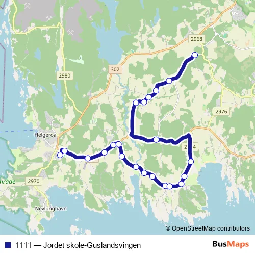 The first stop of the 1111 bus route is Berg skole and the last stop is Haga. 1111 (Jordet skole-Guslandsvingen) is operational during hver dag.