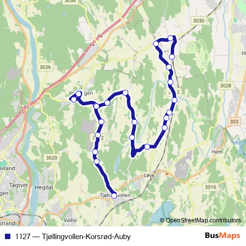 The first stop of the 1127 bus route is Tjodalyng skole and the last stop is Jåberg stasjon. 1127 (Tjøllingvollen-Korsrød-Auby) is operational during på hverdager.