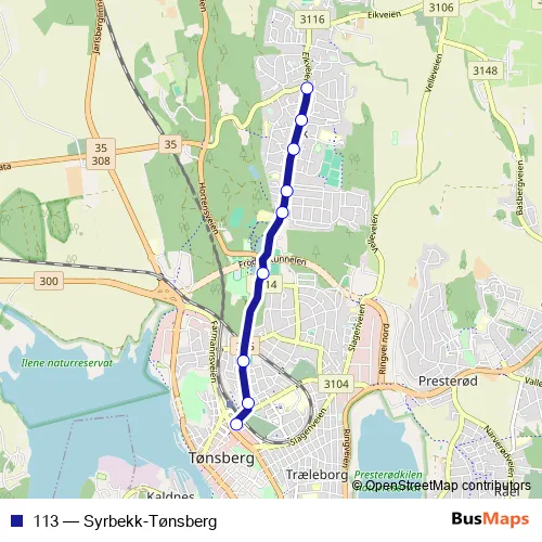 The first stop of the 113 bus route is Tønsberg rutebilstasjon and the last stop is Syrbekk Eikveien. 113 (Syrbekk-Tønsberg) is operational during på hverdager.